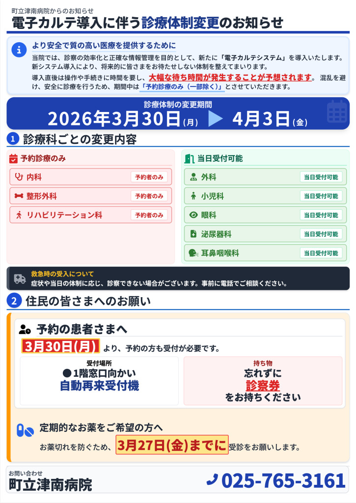 電子カルテ導入に伴う診療体制変更のお知らせ